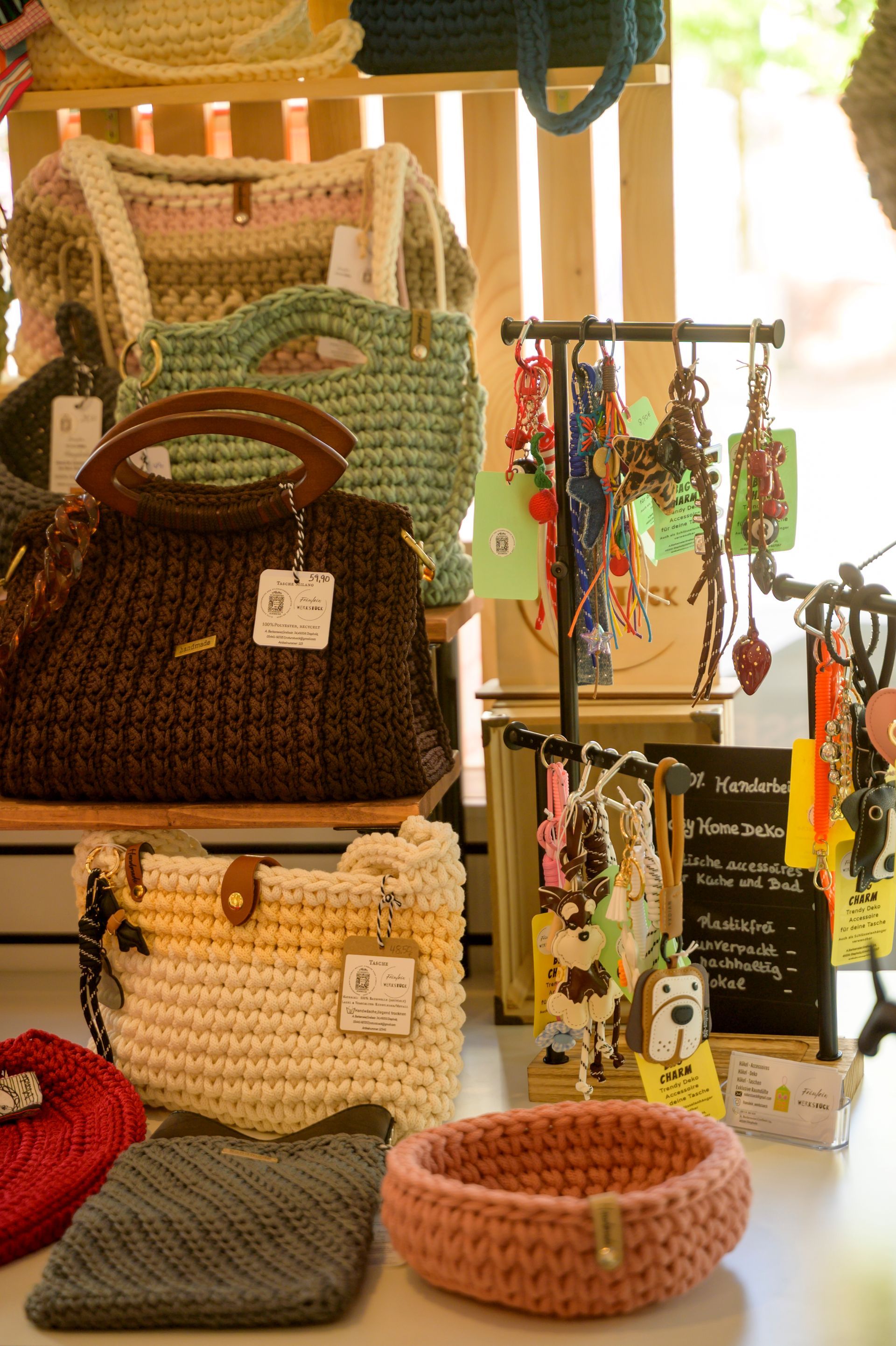 Gehäkeltes Interior und Dekoartikel, wie Taschen, Körbe, Topflappen, Spültücher usw.